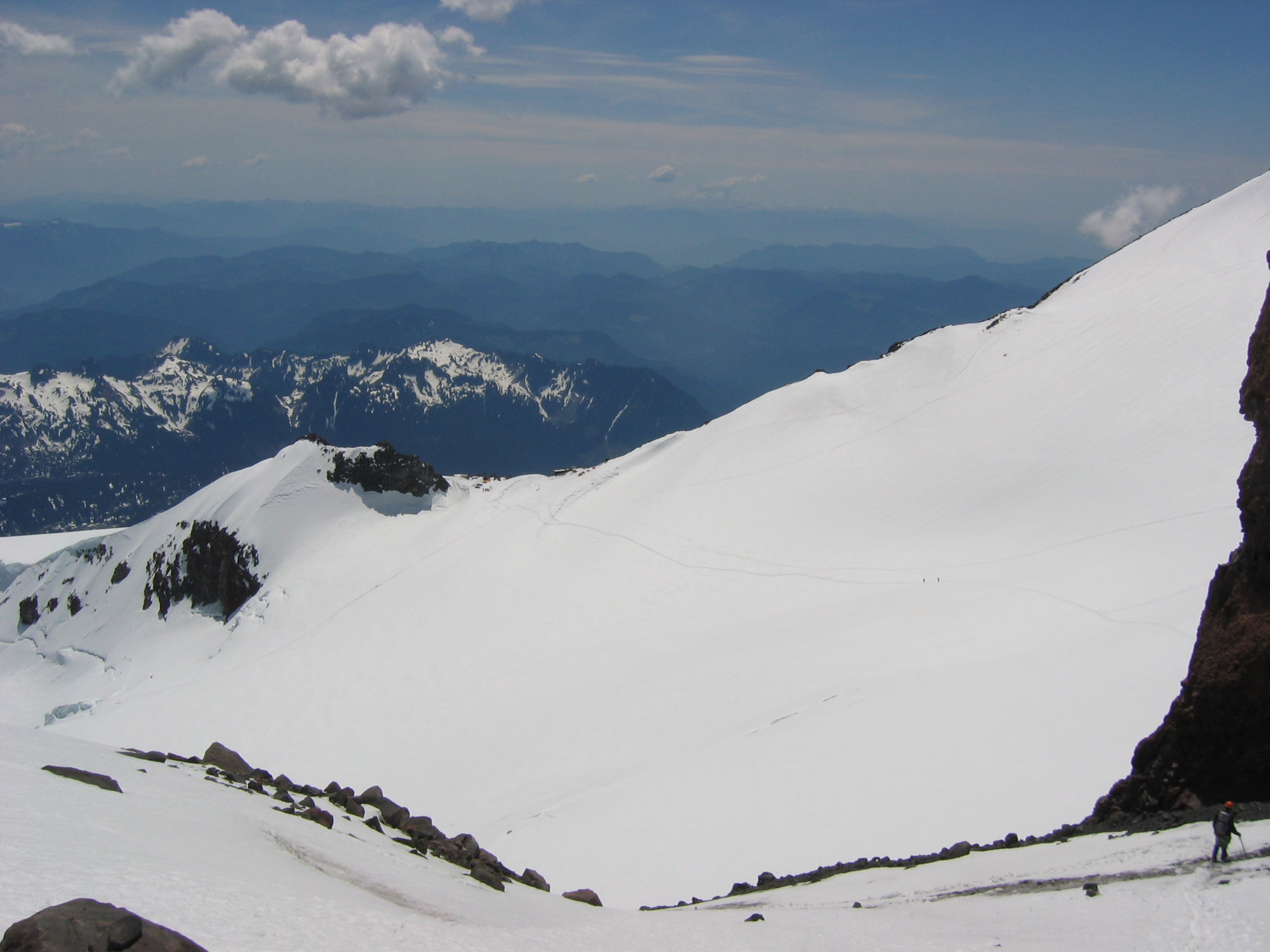 Уже почти вернулись: вид на Camp Muir с нижней оконечности Cathedral Rocks